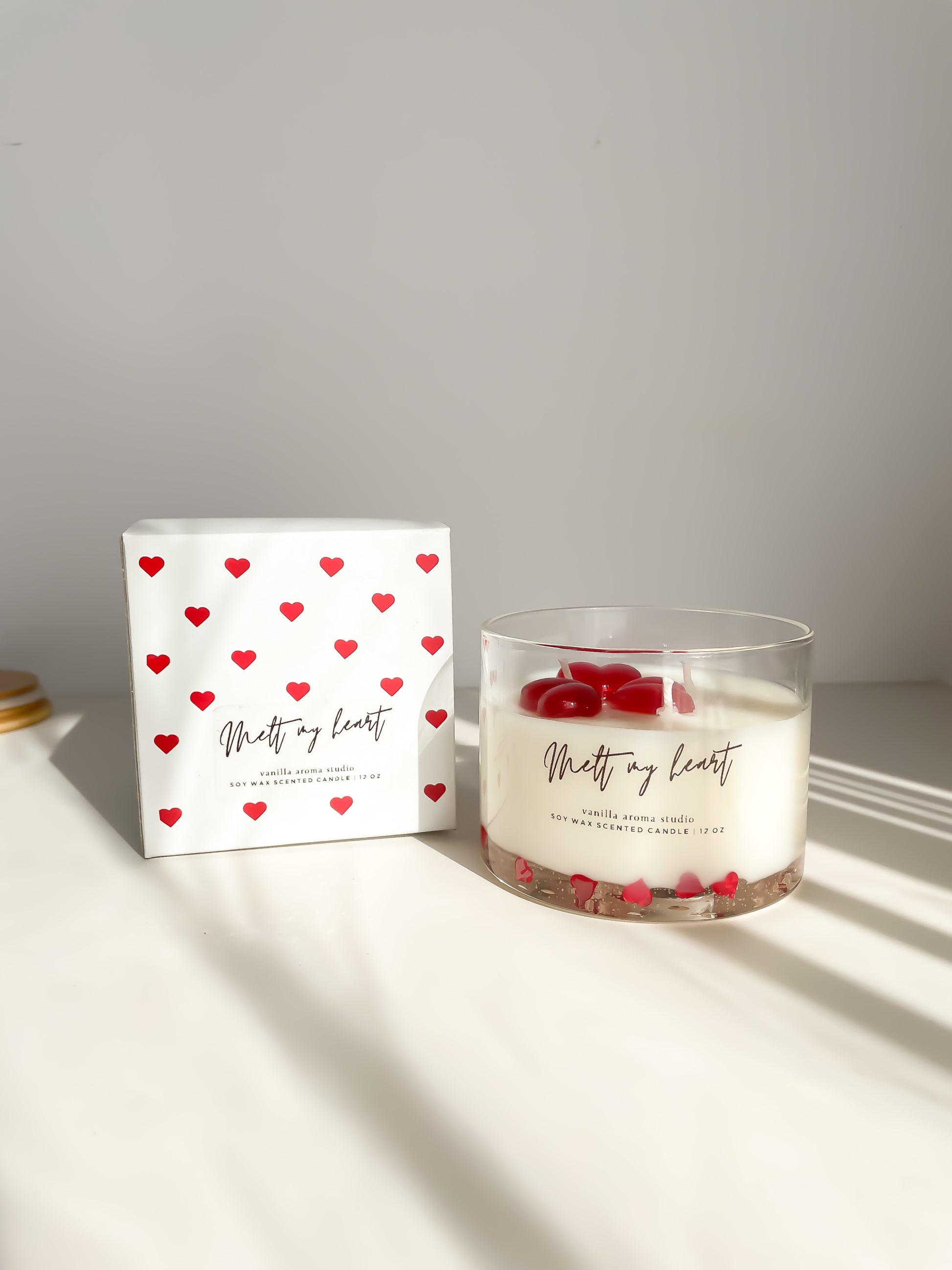 Melt my heart 3-wick candle is decorated with 3 gel wax hearts on top that make it perfect for the Valentine's Day and come in a choice of 5 romantic cents